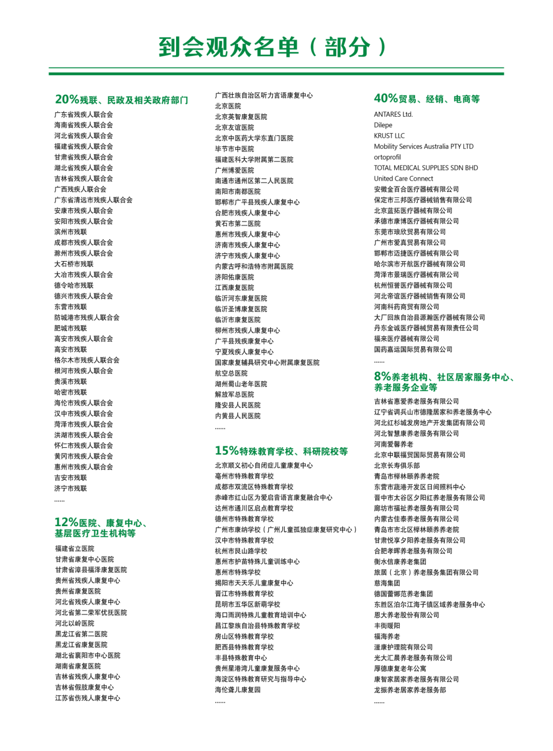 福祉博覽會是由中國殘聯主辦的國家級康復輔具產業盛會,涵蓋助行移動輔具、假肢及矯形器、康復及兒童康復、老年輔具、無障礙設施等多元化產品,匯聚了來自全球各地的專業買家和采購商,國內買家包括全國各級殘聯系統、民政系統、醫療康復機構、養老機構、經銷商等多元買家資源;海外買家來自德國、美國、荷蘭、瑞典等歐美國家,以及中東、日韓、東南亞、澳洲等國家和地區的醫療康復機構、醫院、養老服務機構、當地經銷商、進出口貿易商等核心采購群體。