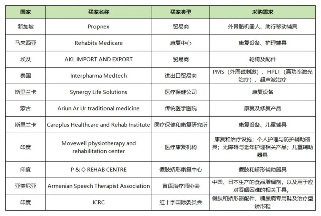 圍繞海外買家的采購需求,福祉博覽會將在9月12日10:00-12:00在北京國家會議中心舉辦“海外買家商貿配對會”,來自埃及、新加坡、馬來西亞、泰國、印度、蒙古、斯里蘭卡等多個國家的專業買家,包括醫院、康復中心、假肢矯形中心、協會組織、貿易商等帶來真實、迫切的采購需求。配對會將助力參展企業和海外買家高效對接,精準洽談,將商機快速轉化為實實在在的訂單,是企業開拓國際市場不可錯過的“快車道”!