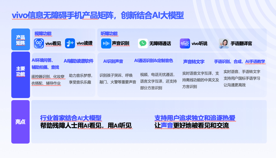 vivo 始終踐行“科技照亮美好未來”的使命,在無障礙領域已構建起系統性解決方案。聽覺上,“vivo 聽說”實時實現語音文字互轉,讓聽障朋友接打電話、面對面交流都順暢;“聲音識別” 敏銳捕捉嬰兒啼哭、汽車喇叭等關鍵音;全球首款“手語翻譯官”更填補空白,識別1300個手語詞匯,準確率超 80%,讓無聲表達被讀懂。視覺上,“vivo 看見”是行業首個依托自研多模態大模型,幫視障朋友描述環境、讀保質期、獨立逛書店陪孩子等;“vivo 讀譜”讓盲人免費學鋼琴,不用再依賴厚重盲譜。從單一功能到生態共建,從技術創新到公益落地,vivo 的無障礙之路始終圍繞“有愛,無礙”的初心。