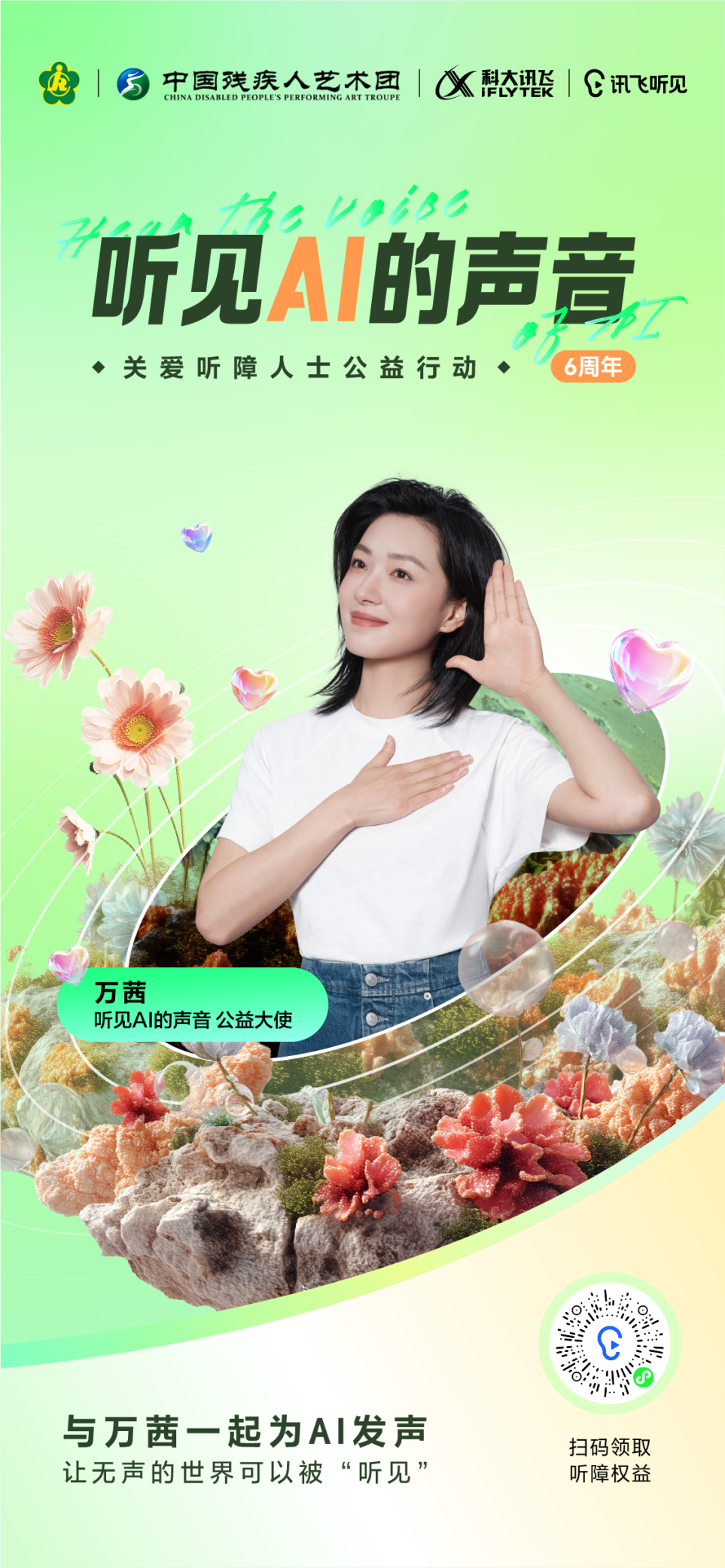 科大訊飛聯合中國聾協、中國殘疾人藝術團于2019年5月19日,全國助殘日正式發起“聽見AI的聲音”關愛聽障人士公益項目。由訊飛聽見作為承辦方,基于訊飛聽見APP、訊飛同傳等系列智能語音轉寫產品,線上線下聯合互動。將他人所述語言實時轉寫成文字,幫助聽障人士在日常社會生活中與他人無障礙交流、理解意思,更好地融入社會,實現價值。該公益項目邀請到著名影視演員萬茜擔任公益大使,2025年科大訊飛攜手央視春晚,為央視春晚無障礙轉播提供實時字幕,讓全國觀眾得以同頻歡樂。今年是“聽見AI的聲音”6周年,截至目前聽障認證提交用戶近10萬人,項目已累計為聽障群體定向捐贈時長超2億分鐘,成為大家工作、生活的AI助手。
