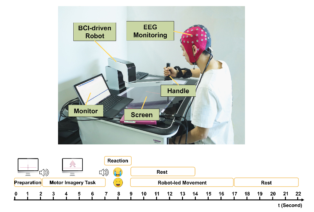 本項腦機交互技術實時解碼人體的運動意圖進而實現控制外部設備執行相應的動作。在康復訓練過程中,患者可通過調動自身的主動運動意圖控制康復機器人牽動偏癱側肢體執行相應的動作,肢體運動反饋至大腦形成感覺,進而影響下一次控制指令的發出,同時,運動感覺反饋可有效的刺激大腦皮質,在神經重塑和功能重建中發揮著重要的作用。腦機交互康復訓練將神經活動和肢體的行為動作建立了聯系,促進患者正向的運動知覺的形成。同時,該方法也在心理層面幫助患者重新建立信心,提高其參與康復訓練的意愿和投入程度。