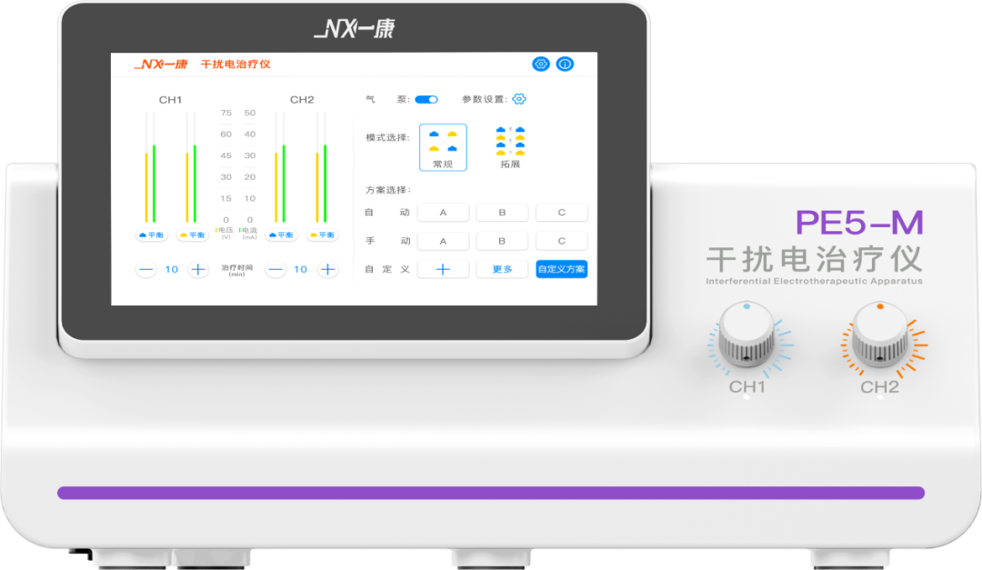 便攜式干擾電治療儀PE5-M是在傳統干擾電療法和動態干擾電療法的基礎上進一步發展起來,在體內形成的低頻干擾內生電流,可以抑制感覺神經,同時促使毛細血管與動脈擴張,局部血液循環的改變有利于炎癥滲出液,水腫的吸收等作用。干擾產生的低頻差,利用中頻電流比低頻電流更高的穿透性,透入人體組織的深層。