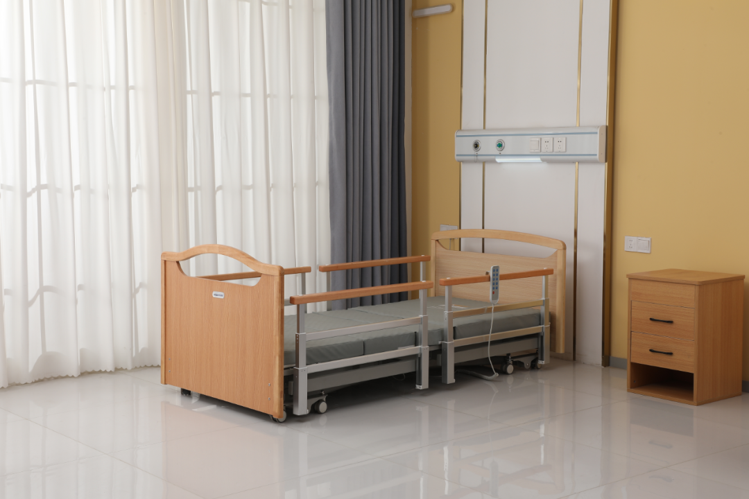此款護理床具有背部升降、腿部升降、一鍵坐起、一鍵復位、整體升降、整體前傾、整體后傾等多種功能,滿足使用者不同體位照護需要,減輕護理人員工作強度。電動遙控操作,使用簡單方便。木質床頭尾,鋁合金兩檔升降護欄,全面防護,風格溫馨,高端上檔次,是一款功能強大的高端護理家具。超低設計,即便老人從床上滑落也不會摔傷。