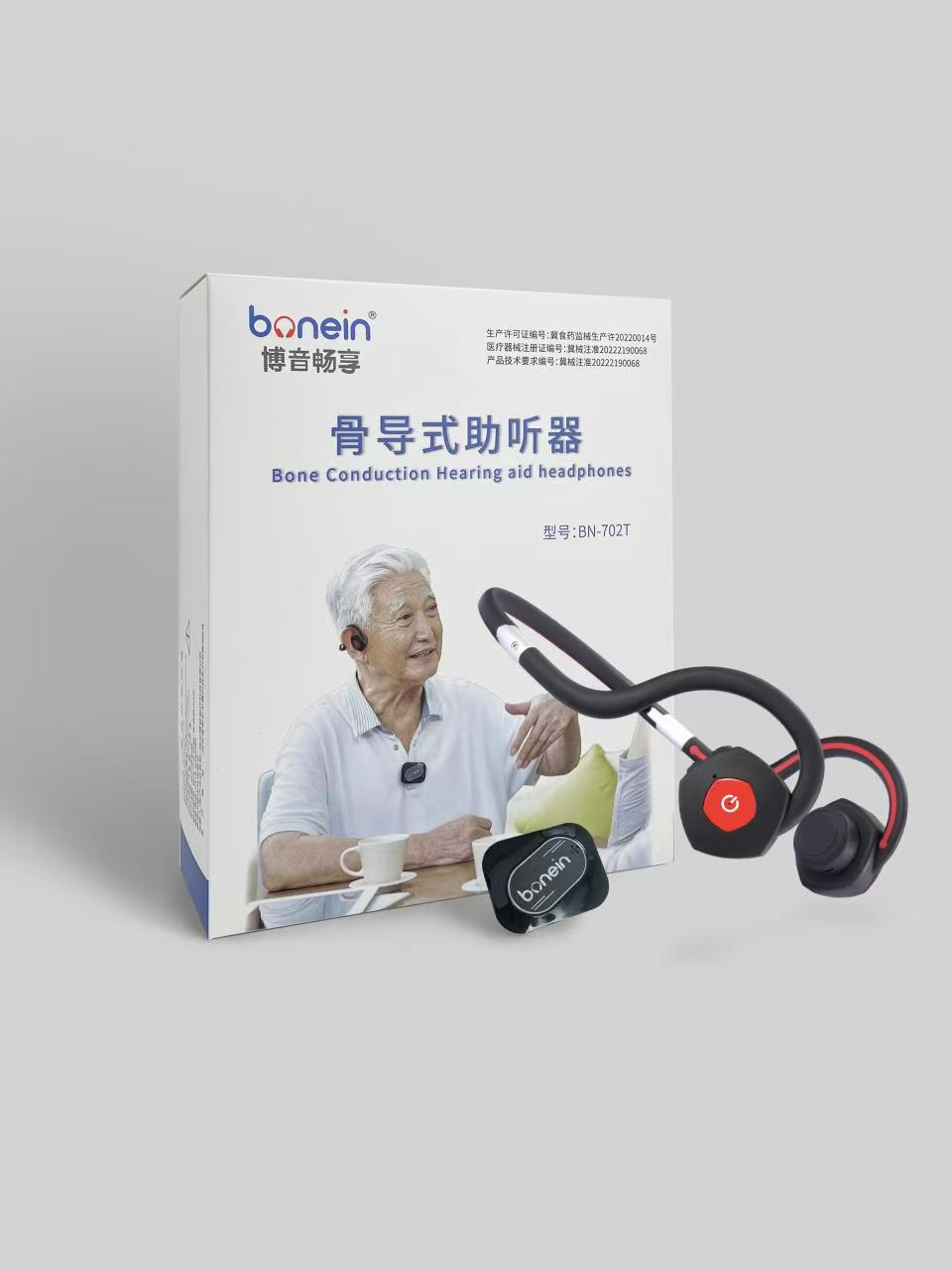 骨導式助聽器BN-702T,不用塞進耳朵,通過骨頭聽聲音,讓用戶聽到聲音同時還可以舒適佩戴。適合重度及重度以上用戶使用。無線連接,方便用戶多場景使用。比如:拾音盒放在電視機旁邊,用戶可以戴著收音頭帶,用很小音量看電視,不會影響家人小孩。公司獲得10多項專利認證。