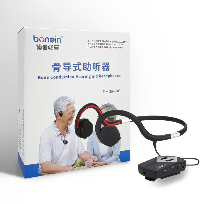 骨導式助聽器BN-803,不用塞進耳朵,通過骨頭聽聲音,讓用戶聽到聲音同時還可以舒適佩戴。這款左右耳音量單獨調節,讓用戶左右聽聲保持平衡;有7個頻段選擇,用戶在家選擇合適頻段就可以使用;另外還可以連接手機打電話聽音樂。一鍵降噪功能,抑制噪音,增強人聲。公司獲得10多項專利認證。