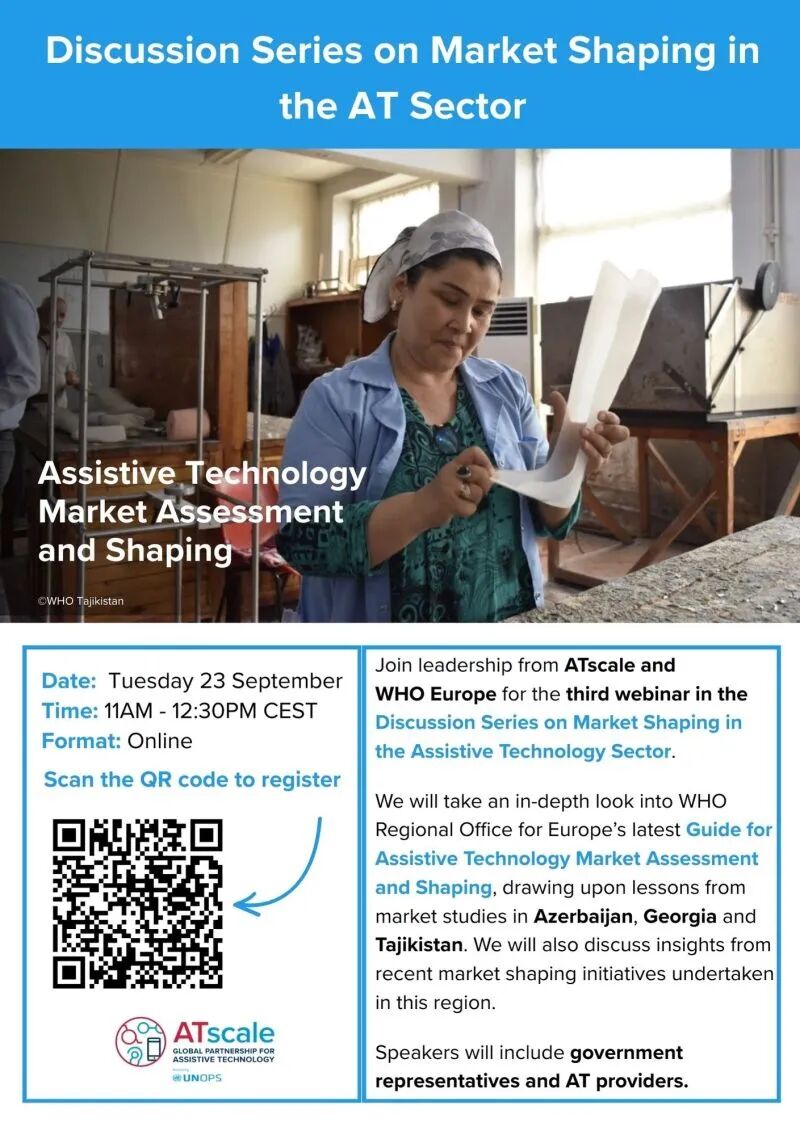 研討會將重點介紹由世衛組織歐洲區域辦事處近期發布的《輔助技術市場評估與塑造指南》,并分享塔吉克斯坦和格魯吉亞的市場研究成果。除了對該指南進行深入解讀,研討會還將探討該地區最新開展的市場研究和市場塑造舉措,并討論這些舉措在其他中低收入國家的應用前景。本次研討會也是一個向國際同行學習的寶貴機會,與會發言人將包括各國政府代表、輔助技術服務供應商,以及 ATscale 和世衛組織的高層。