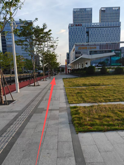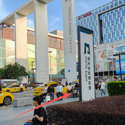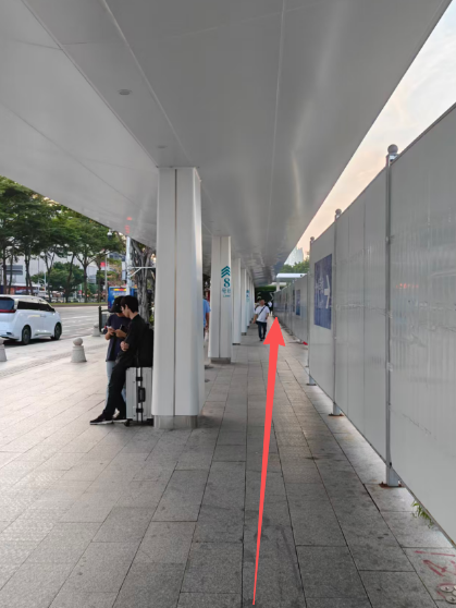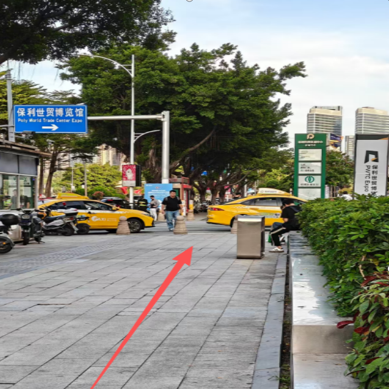 (2)按照箭頭所指方向前行,轉右,約前行100米即可抵達【保利世貿博覽館E4門】。