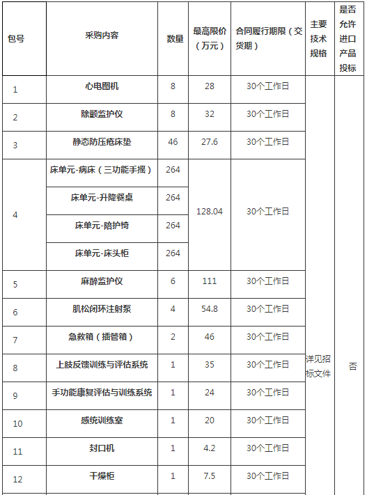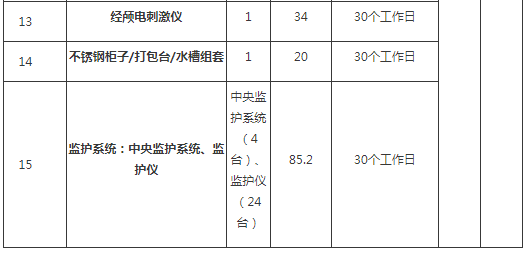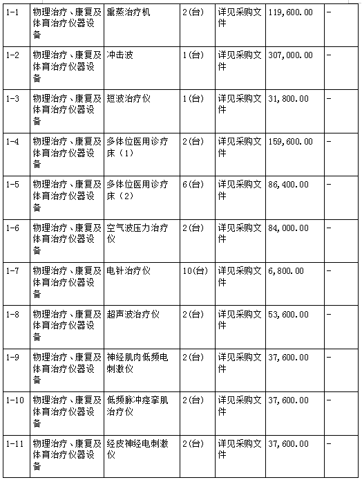 動態心電儀1臺、排痰機1臺、霧化器1臺、電動多功能床3張、糖尿病治療儀1臺、微循環修復系統1套、熏蒸儀1臺、輪椅3把、幽門螺旋桿菌測定儀1臺(含設備運輸、安裝、調試及售后具體參數詳見招標文件)。