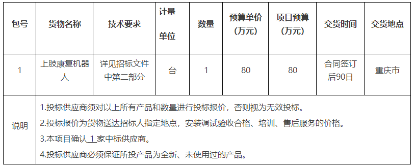 項目名稱:重慶市某單位上肢康復機器人招標公告(2022-JL13(03)-W10330)