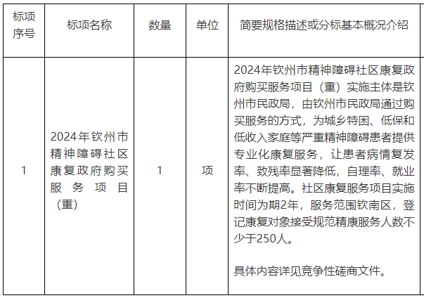 廣西榮勝項目管理有限公司關于2024年欽州市精神障礙社區康復政府購買服務項目(重)(QZZC2024-C3-990301-RSZB)競爭性磋商公告