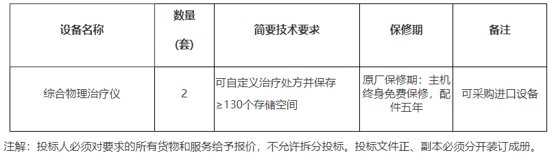 采購需求:采購便攜式肺功能評估儀3套,床旁手功能訓練器4套,神經功能電刺激(低頻)6套,磁振墊4套,全自動康復病床4套,高頻胸壁振蕩排痰儀2套,氣壓治療儀2套,超聲治療儀1套,智能無線電刺激系統4套,電動起立床2套,富血小板凝膠治療儀1套,具體詳見要求招標文件第六章《招標內容及要求》。