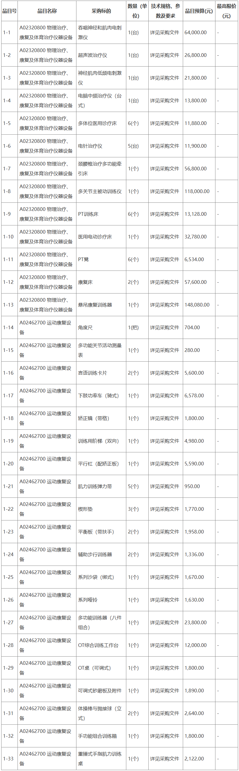 采購需求:購置臥式踏車(含多導心電、血壓、血氧)2臺,運動訓練控制系統1臺,減重步態康復平臺 (成人+兒童)1臺,多點多軸懸吊訓練系統1臺,持續被動關節活動儀(CPM機/下肢連續被動訓練儀)1臺,康復訓練床(可升降)5臺,電動起立床4臺,經顱磁刺激儀1臺,可調式砂磨板及附件1臺,訓練套圈2臺,模擬生活作業訓練套件1臺,花生球6臺,大龍球(巴氏球)6臺,沙袋車2臺,握力計2臺,木插板2臺,手指階梯2臺,上螺絲2臺,上螺母2臺,系列啞鈴2套,OT桌4臺