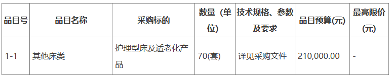 采購需求:活護理和醫療設備采購,包括護理床、氣墊床、專用沐浴床椅、電加熱保溫餐車、搶救床、吸痰器、無菌柜、紫外線燈。