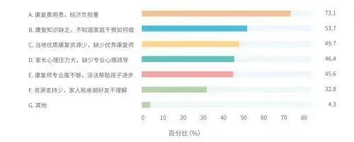 總體來看,康復費用貴、康復資源少,服務質量不夠高是家長們普遍面臨的問題?!端{皮書》顯示,73.1%的家長認為“康復費用貴,經濟負擔重”是主要困難。其次是“康復知識缺乏,不知道家庭干預如何開展”,占比 53.7%,以及“當地優質康復資源少,缺少優秀康復師”占比 49.7%。