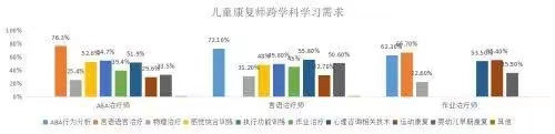 可喜的是,兒童康復行業已經展現出多學科精準康復的趨勢。從兒童康復師學習需求的角度來看,也呈現出多學科融合發展的趨勢。其中,在所調查的兒童康復師中,76.3%的ABA治療師希望學習言語語言治療技術,占比近8成;72.1%的言語治療師希望學習ABA行為分析技術,占比超過7成;同時,分別有66.7%和62.3%的作業治療師希望學習言語語言治療和ABA行為分析技術,超過6成。在兒童康復學科越發細分,越發專業的同時,學科融合的趨勢也越加明顯。