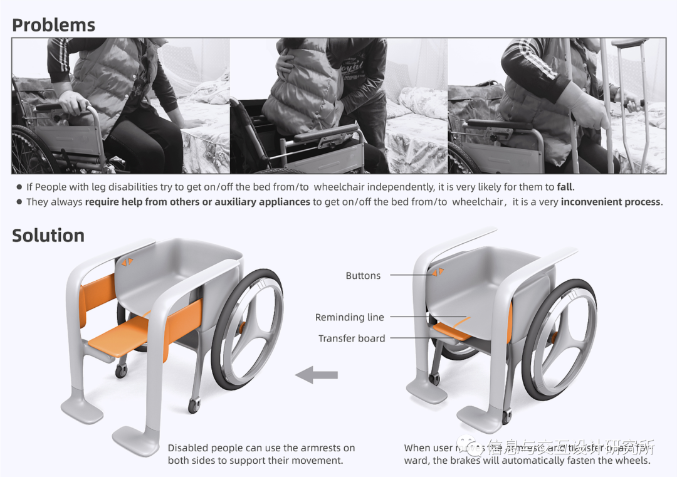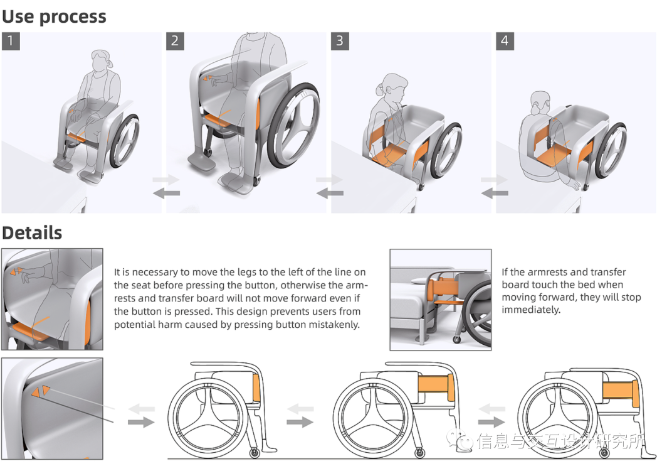 通過在輪椅上設計可伸收的扶手和轉移板,方便腿部殘疾人士不需要他人的幫扶或者輔助器具,利用自身力量挪動就可以自行上下床。這種上下床方式既安全又省力。