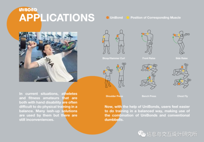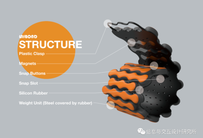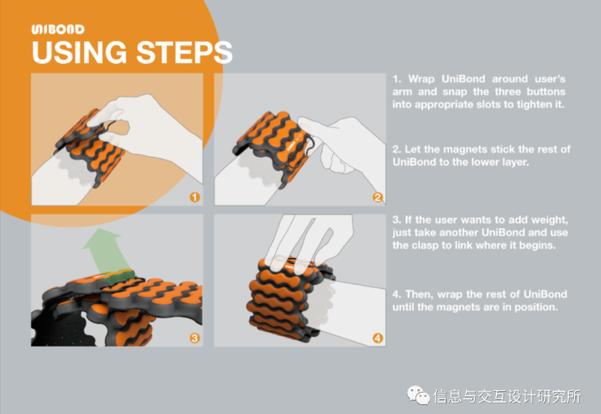 UniBond是一款適合手臂和手部截肢者的健身配重帶。無法雙手同時握住啞鈴的人,在UniBond的幫助下,仍然可以方便、輕松地進行均衡鍛煉。用戶可以用他/她有能力的手將它纏繞在另一個人的手腕上,然后卡扣和磁鐵使其保持緊密和穩定。此外,外觀設計和明亮清新的色彩選擇給人以力量和活力的感覺,鼓勵用戶進行鍛煉。