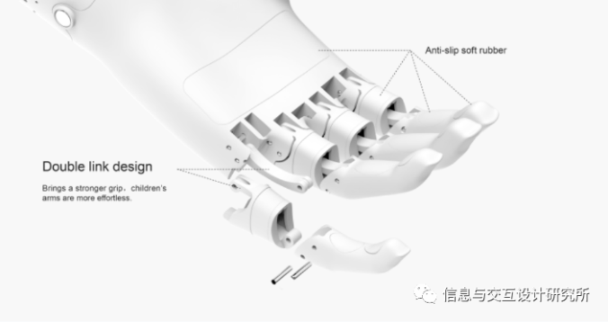 創新的抓握結構更省力抓握性強,可調節的拉力線松緊結構滿足長時間使用損耗仍保持最佳驅動力,采用3D打印生產方式,成本低,且可定制化設計,舒適的人機設計,滿足6-12歲兒童佩戴的舒適性。