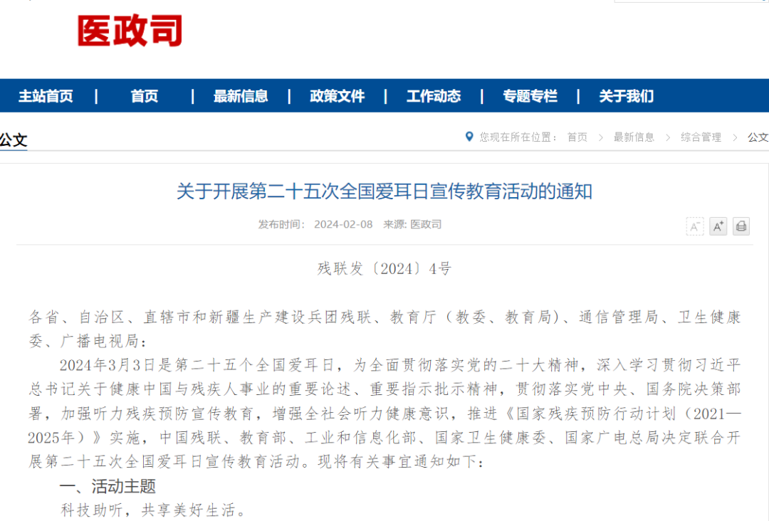 今年3月3日是第二十五個全國愛耳日,主題為“科技助聽,共享美好生活”。中國殘疾人聯合會、教育部、工業和信息化部、國家衛生健康委員會、國家廣播電視總局日前聯合發布《關于開展第二十五次全國愛耳日宣傳教育活動的通知》,旨在加強聽力殘疾預防宣傳教育,增強全社會聽力健康意識,推進《國家殘疾預防行動計劃(2021—2025年)》實施。