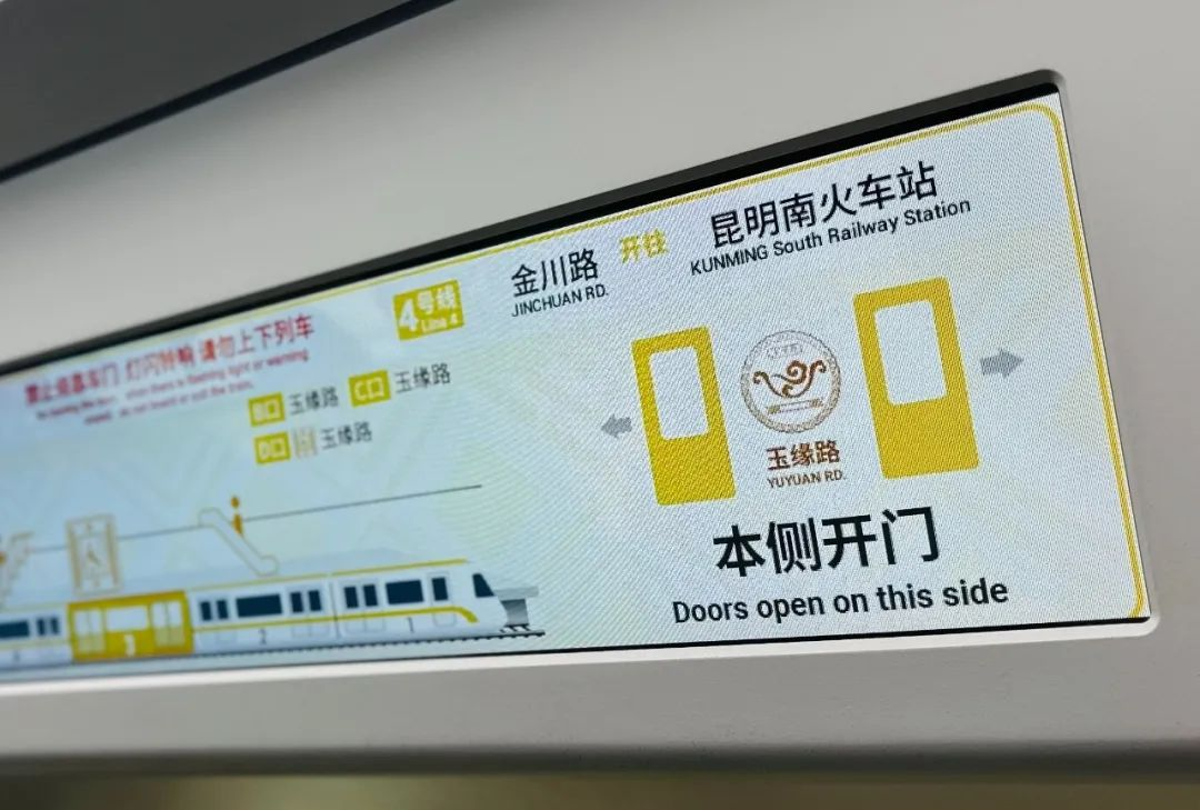 在車站內,昆明地鐵4號線公告欄新增公示公告適老化二維碼,乘客可通過掃描二維碼獲取具備大字、語音播報功能的公示公告;在列車上,新版列車動態地圖固定顯示乘車信息、新增關鍵信息顯示、增大字體內容;列車上可顯示新增服務熱線、各出入口周邊信息、設施信息等8個關鍵信息,以及車站衛生間、站臺至站廳樓梯、扶梯、無障礙電梯等區域的位置;非開門側固定顯示線路圖,增大顯示對側開門信息,新增預計到站時間以及各換乘站換乘線路信息……