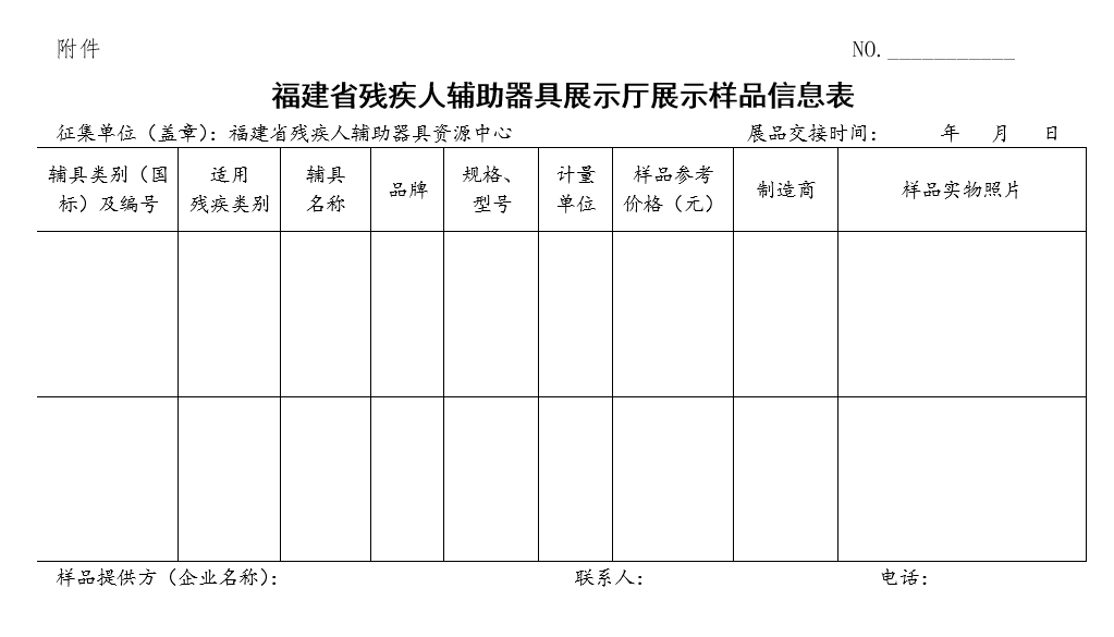 (一)請意向企業整理展品清單,詳細填寫《福建省殘疾人輔助器具展示廳展示樣品登記表》(附件)。
