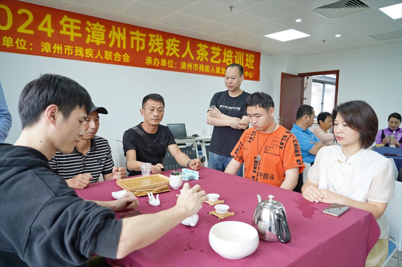 近日,由漳州市殘聯主辦、漳州市殘疾人就業服務指導中心承辦的2024年漳州市殘疾人茶藝培訓班在漳州市國家級殘疾人職業培訓基地舉辦。在老師指導下,30名殘疾人學員逐漸掌握了茶葉沖泡的技巧。