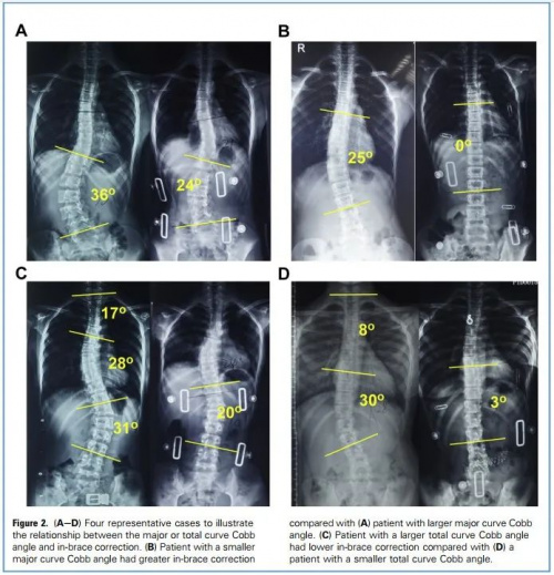 研究發現,隨著脊柱側彎主彎Cobb角度和側彎總Cobb角度(全脊柱中所有側彎Cobb角度之和)的加大,支具即刻矯形率相應地下降,兩者呈負相關。本研究還闡明了其他一些因素和初次支具治療矯形率的關系,為支具的設計和制造提供了十分寶貴的信息和參考,對控制進展、減少手術需要、提高患者生活質量有十分重要的意義。