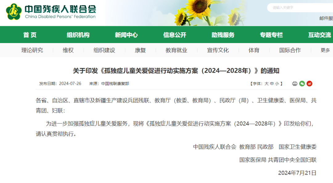 2024年7月21日,中國殘聯、教育部、民政部、國家衛生健康委、國家醫保局、共青團中央、全國婦聯等七部門,聯合印發《孤獨癥兒童關愛促進行動實施方案(2024-2028年)》(以下簡稱《方案》)。