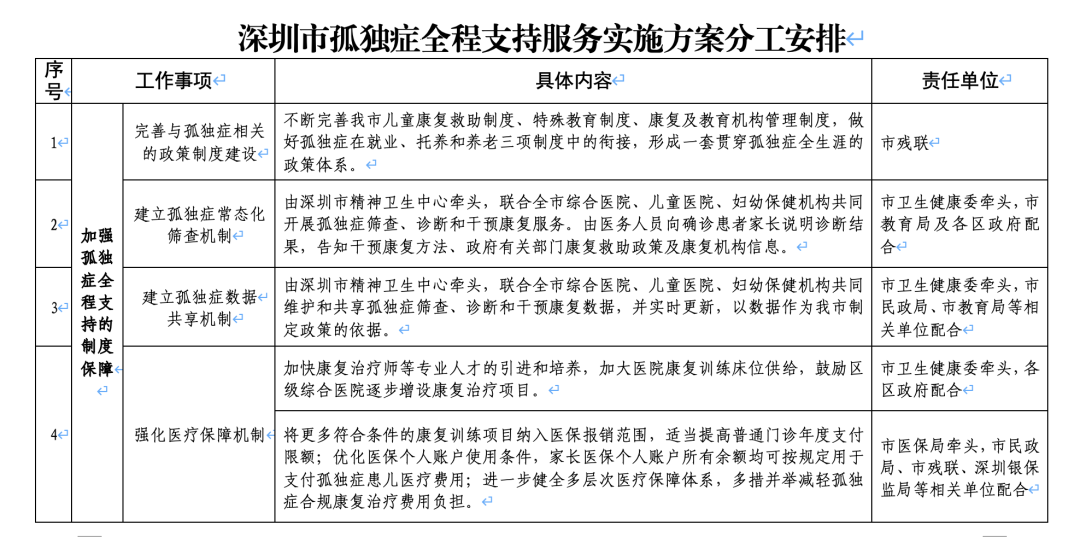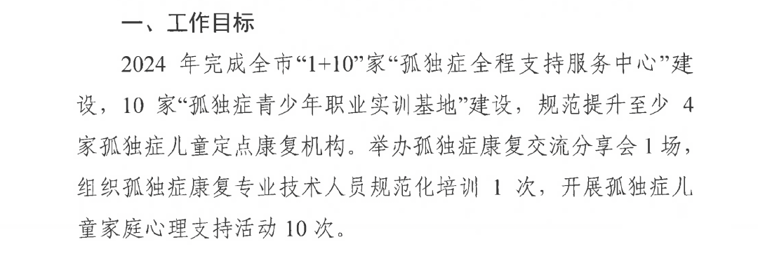 在此之前,深圳市已于2023年10月印發《深圳市孤獨癥全程支持服務實施方案》,提出六大方面31項工作任務,希望實現的工作目標是: