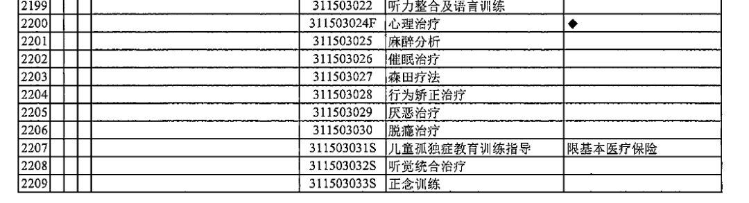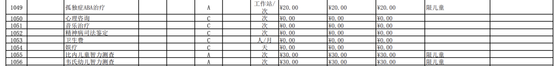 除了在康復項目中有孤獨癥兒童語言障礙訓練和ADI量表測評外,在精神科的診療項目中,還將ABA治療納入了A類項目。