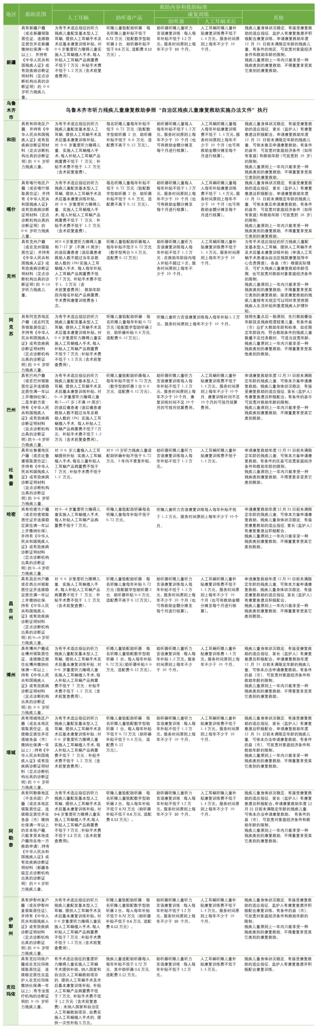 具有人工耳蝸植入適應指征的未滿7周歲聽力殘疾、多重殘疾(含聽力殘疾)兒童,未享受免費配置基本型人工耳蝸和基本醫療保險支付,自行接受人工耳蝸植入的,在最高70000元標準內按實享受一次性補貼,每人限補貼人工耳蝸1臺。18周歲前植入人工耳蝸的低保低邊家庭殘疾兒童,術后8年以上需升級體外言語處理器(聲音處理器、音頻處理器)的,在最高30000元標準內按實享受一次性補貼 。