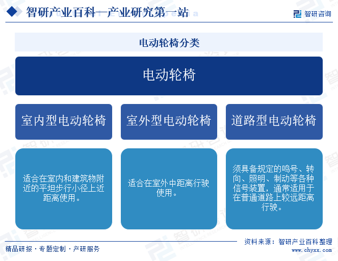 電動輪椅是一種利用電力驅動的輪椅,通常在其基礎結構中安裝有電源、電機、控制器等部件,依靠電機作為動力源,通過操作控制裝置控制電機驅動輪椅完成前進、后退、轉向等運動。相比于手動輪椅,電動輪椅具有活動范圍大、省力的特點。電動輪椅按照使用場所分類可以分為室內型電動輪椅、室外型電動輪椅、道路型電動輪椅。