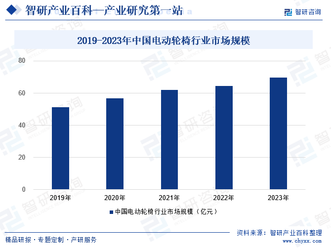 隨著全球人口老齡化的不斷加劇以及殘疾人口數量的穩步增長,電動輪椅車的需求正呈現出顯著的增長趨勢。面對行動不便的困境,越來越多的老年人開始依賴電動輪椅作為他們日常生活中的重要代步工具,而殘疾人群體更是迫切需要電動輪椅來滿足他們的出行需求。2023年中國電動輪椅行業市場規模為69.72億元,同比增長8.13%。隨著國內老齡化問題的日益凸顯,預計對電動輪椅車的需求將持續增加,從而推動整個行業市場規模的進一步上漲。