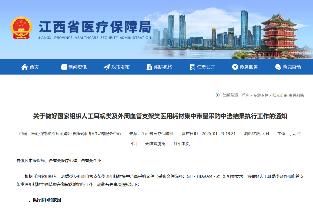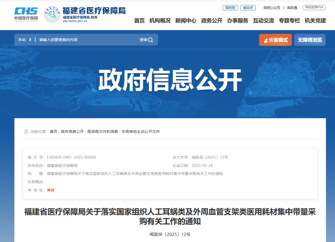 2月28日,福建醫保局發布《關于落實國家組織人工耳蝸類及外周血管支架類醫用耗材集中帶量采購有關工作的通知》,其中指出,人工耳蝸類中選結果于2025年3月7日在福建省醫療保障信息平臺藥品和醫用耗材招標和采購交易子系統掛網,3月11日起正式執行;外周血管支架類中選結果于5月12日在招采子系統掛網,5月14日起正式執行。