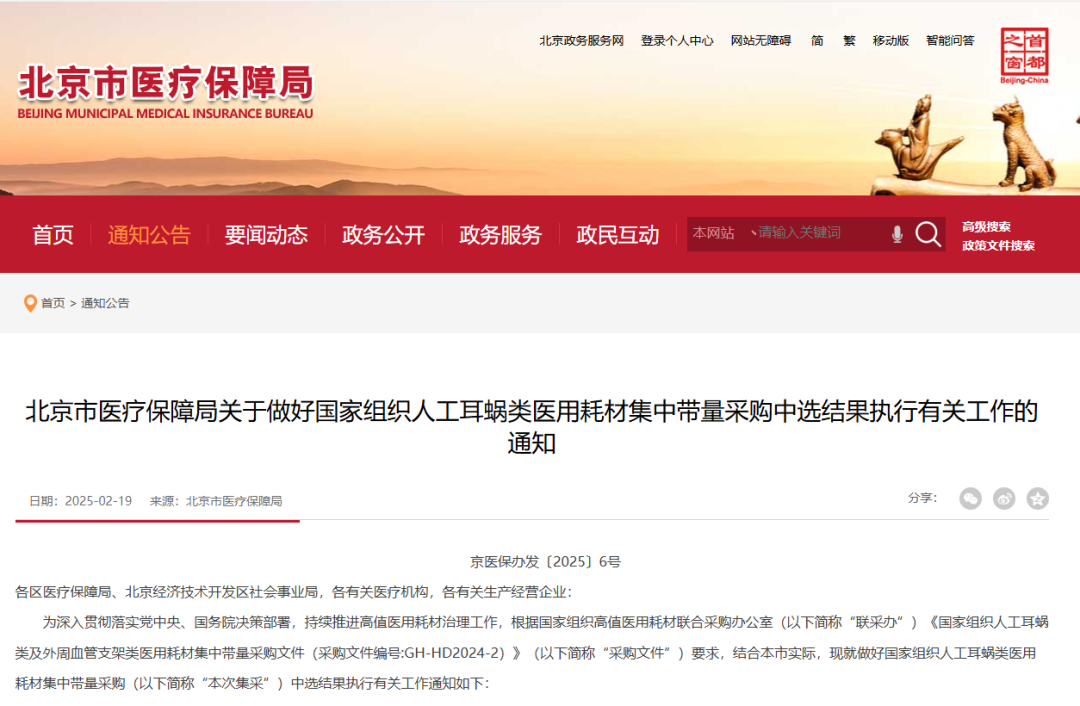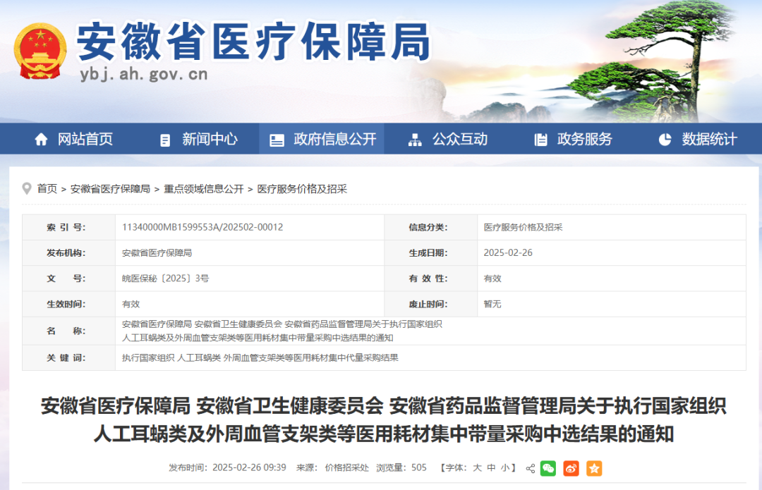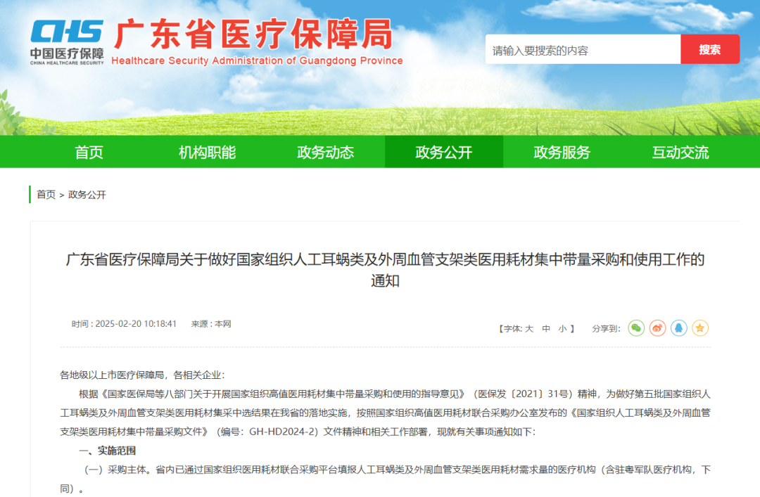 3月3日,陜西省醫療保障局發布《關于做好人工耳蝸等醫用耗材集中帶量采購和使用工作的通知》,其中指出,自2025年3月31日起執行人工耳蝸、乳房旋切針、血管組織閉合用結扎夾、導引導管和導引導絲、預充式導管沖洗器等醫用耗材集中帶量采購中選結果;自2025年5月1日起執行外周血管支架集采中選結果。其中人工耳蝸、外周血管支架、乳房旋切針采購周期3年,血管組織閉合用結扎來、導引導管和導引導絲接續采購周期2年,預充式導管沖洗器采購周期1年。