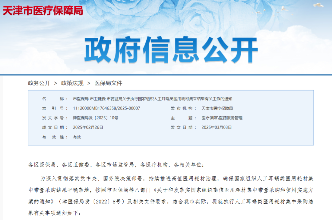 3月3日,天津市醫保局聯合有關部門發布了《關于執行國家組織人工耳蝸類醫用耗材集采結果有關工作的通知》,自3月1日起,天津市相關患者可以使用上集采降價后的人工耳蝸中選產品,標志著國家集采人工耳蝸中選結果在津正式落地。