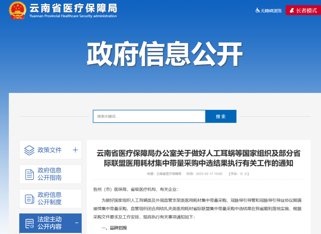 2月7日,云南省醫療保障局正式發布《云南省醫療保障局辦公室關于做好人工耳蝸等國家組織及部分省際聯盟醫用耗材集中帶量采購中選結果執行有關工作的通知》,規定國家組織人工耳蝸類醫用耗材集中帶量采購、冠脈導引導管和冠脈導引導絲協議期滿接續集中帶量采購、血管組織閉合用結扎夾類醫用耗材省際聯盟集中帶量采購中選結果自2025年3月1日起執行。