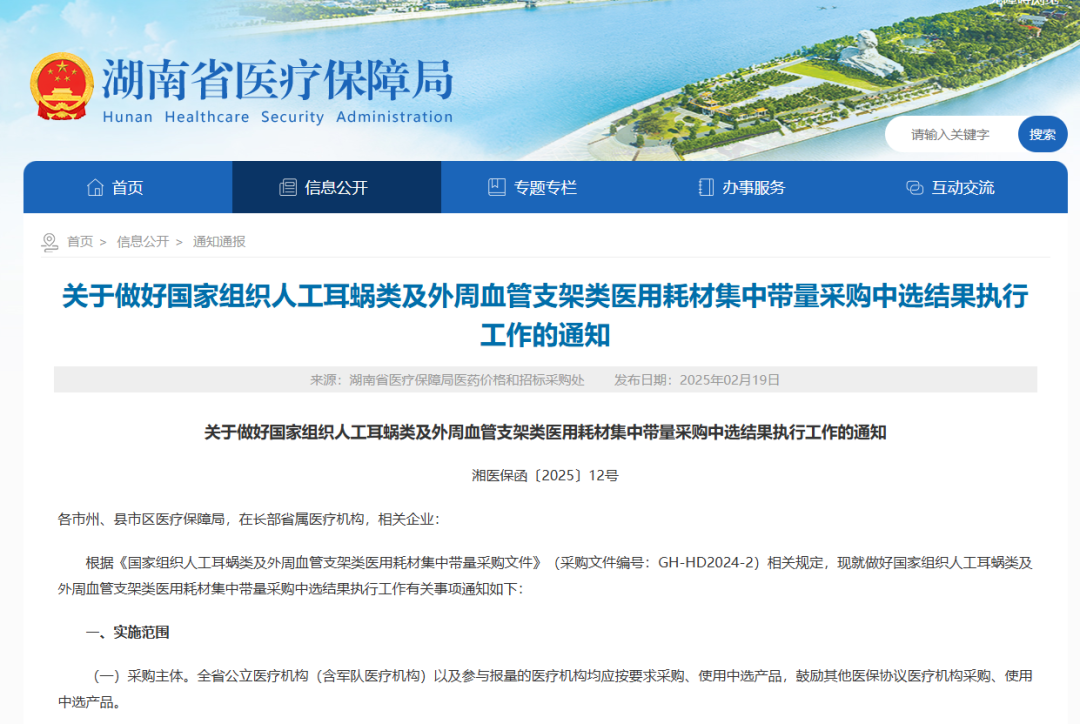2月19日,湖南省醫療保障局發布了《關于做好國家組織人工耳蝸類及外周血管支架類醫用耗材集中帶量采購中選結果執行工作的通知》。其中明確,今年3月3日起,全省開始執行人工耳蝸類耗材集采中選結果。