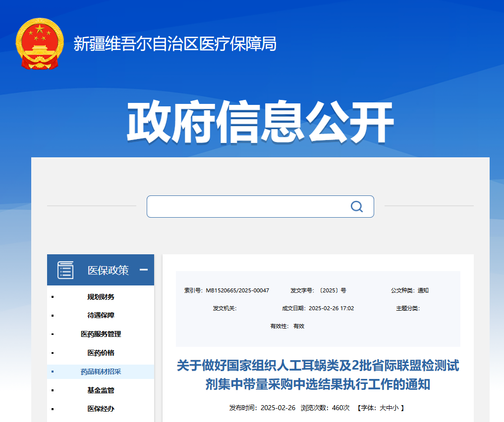 3月3日,新疆維吾爾自治區醫療保障局發布通知,明確自2025年3月1日起正式執行人工耳蝸集中帶量采購中選結果,并于3月15日同步落地安徽2023年體外診斷試劑、江西腎功和心肌酶生化類檢驗試劑集采成果。