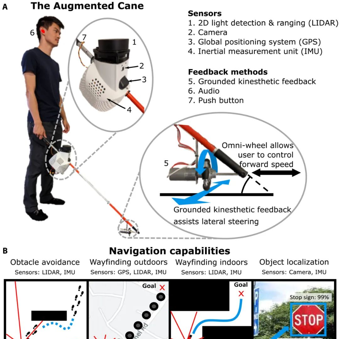 除此之外,斯坦福大學智能系統實驗室也研發出了一款智能導盲手杖。該手杖搭載了激光雷達、GPS,可根據目的地進行實時導航,也可為視障人群進行障礙探測并規劃路線。