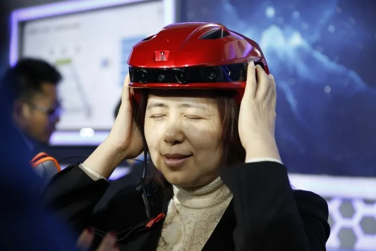 來自江蘇的郭萍在年輕時因患視網膜色素變異而導致雙眼失明。如今,她戴著智能助盲帽,在志愿者的陪同下,對智能助盲帽進行了體驗。郭萍表示,在穿戴上助盲帽時,她的世界又“亮”了起來,周圍的環境也都轉變為了語音。