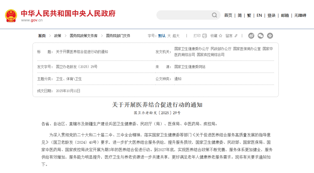 近日,國家衛生健康委辦公廳、民政部辦公廳、國家醫保局辦公室、國家中醫藥局綜合司、國家疾控局綜合司聯合印發了《關于開展醫養結合促進行動的通知》。提出七個方面25項具體任務:完善服務資源布局,包括健全醫養結合服務體系、支持拓展醫養結合功能、深化醫聯體內醫養協作等;加強人才隊伍建設,包括擴大專業人才培養規模、提升從業人員專業水平、開展健康教育和照護技能培訓等;發展居家和社區服務,包括加強老年人健康管理、提升家庭醫生簽約質效、提供社區嵌入服務等;拓展服務供給,包括深化醫養機構服務有效銜接、深化中醫藥醫養結合服務、普及心理健康知識、加大醫保支持力度、加強信息化支撐等;強化失能失智老年人服務保障等等。